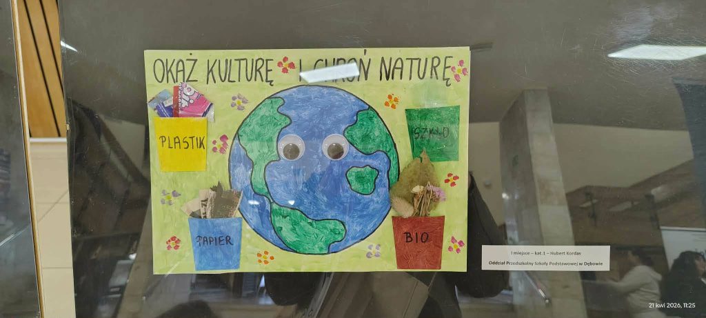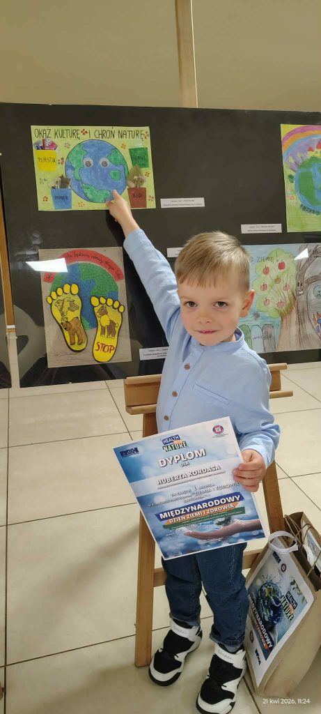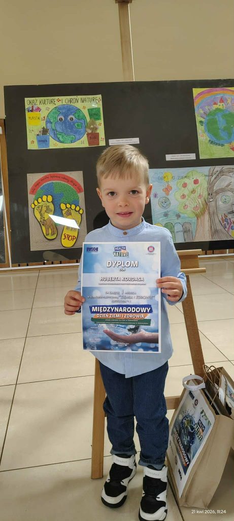 Z ogromną radością informujemy, że Hubert Kordas, uczeń oddziału przedszkolnego „Krasnoludki” zdobył I miejsce w konkursie plastycznym organizowanym przez Miejski Ośrodek Kultury oraz Powiatową Stację Sanitarno- Epidemiologiczną w Przeworsku z okazji Międzynarodowego Dnia Ziemi i Zdrowia.